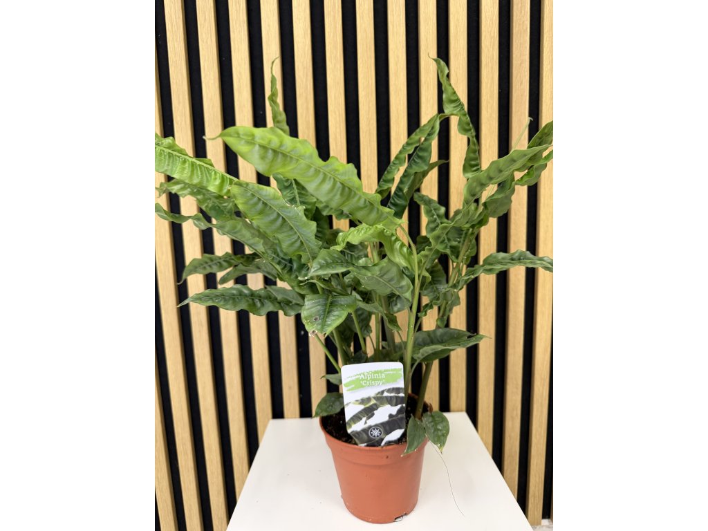 Hlavním lákadlem Alpinie ‘Crispy’ jsou úzké, podlouhlé listy s výrazně zvlněnými okraji, které rostlině dodávají dynamický a elegantní vzhled. Listy jsou svěže zelené, lesklé a vyrůstají na pevných vzpřímených stoncích. Celkově působí velmi svěže, exoticky a dekorativně, ať už jako solitérní rostlina, nebo součást větší zelené kompozice. Má ráda teplo a vyšší vzdušnou vlhkost, proto se jí daří zejména v koupelnách s oknem nebo v místnostech s pravidelným rosením.