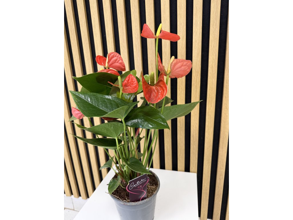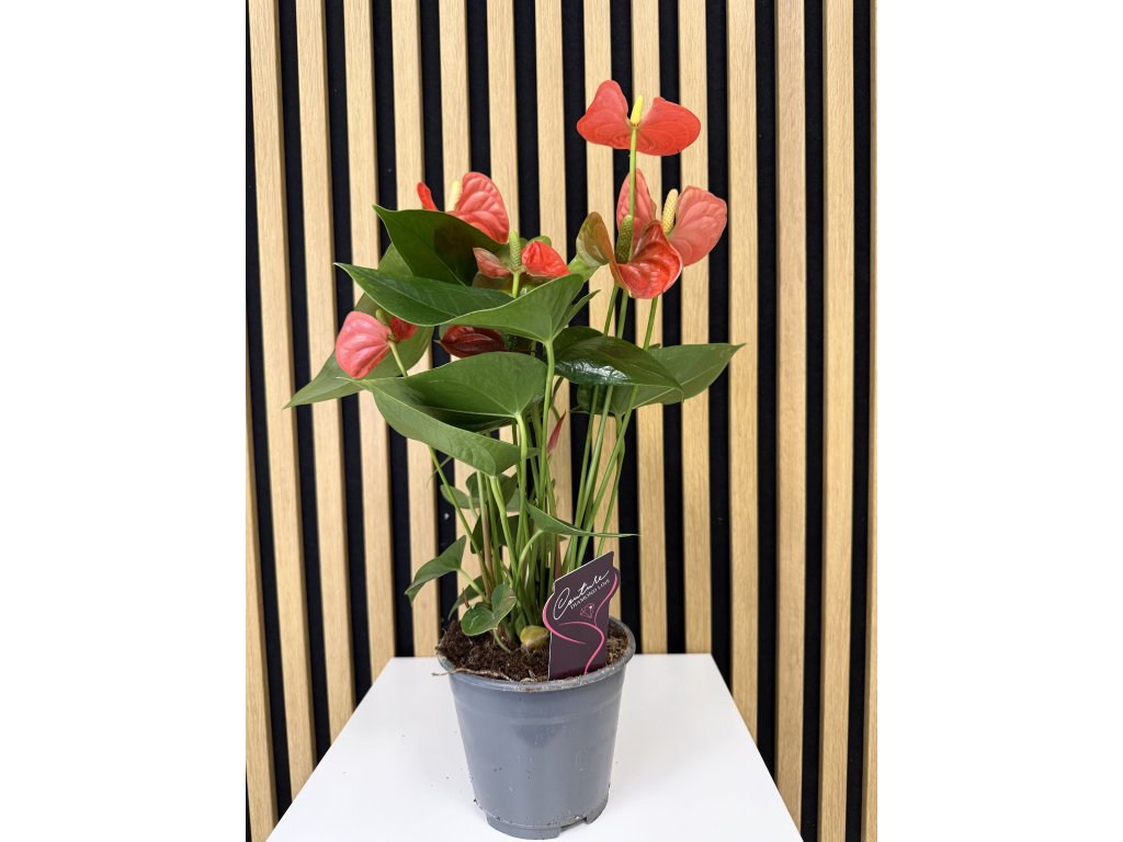 Anthurium je stálezelená rostlina. Její květy, tvořené barevným toulcem a žlutou palicí uprostřed, jsou symbolem elegance a dlouhověkosti – často vydrží kvést i několik měsíců. Díky kompaktnímu růstu se skvěle hodí do moderních interiérů, kanceláří i reprezentativních prostor.