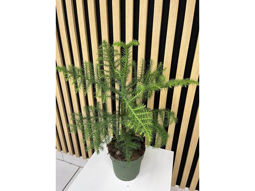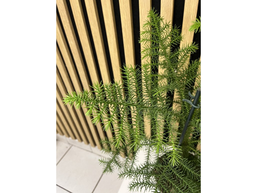 Araukárie (Araucaria heterophylla), známá také jako norfolkská borovice, je výjimečná pokojová rostlina, která do interiéru přináší kousek přírody a atmosféru klidu. Na rozdíl od běžných jehličnanů má jemné, měkké jehličí uspořádané v dokonalých patrech, což jí dodává elegantní, až sochařský vzhled. Vypadá jako malý strom z pohádky – ideální doplněk pro moderní i přírodní interiér.