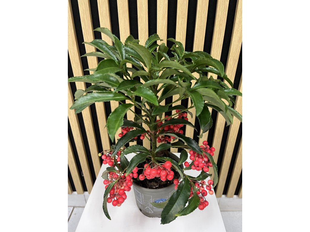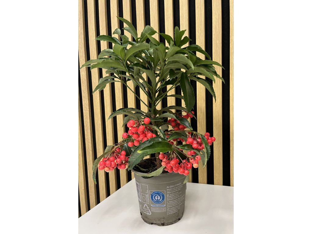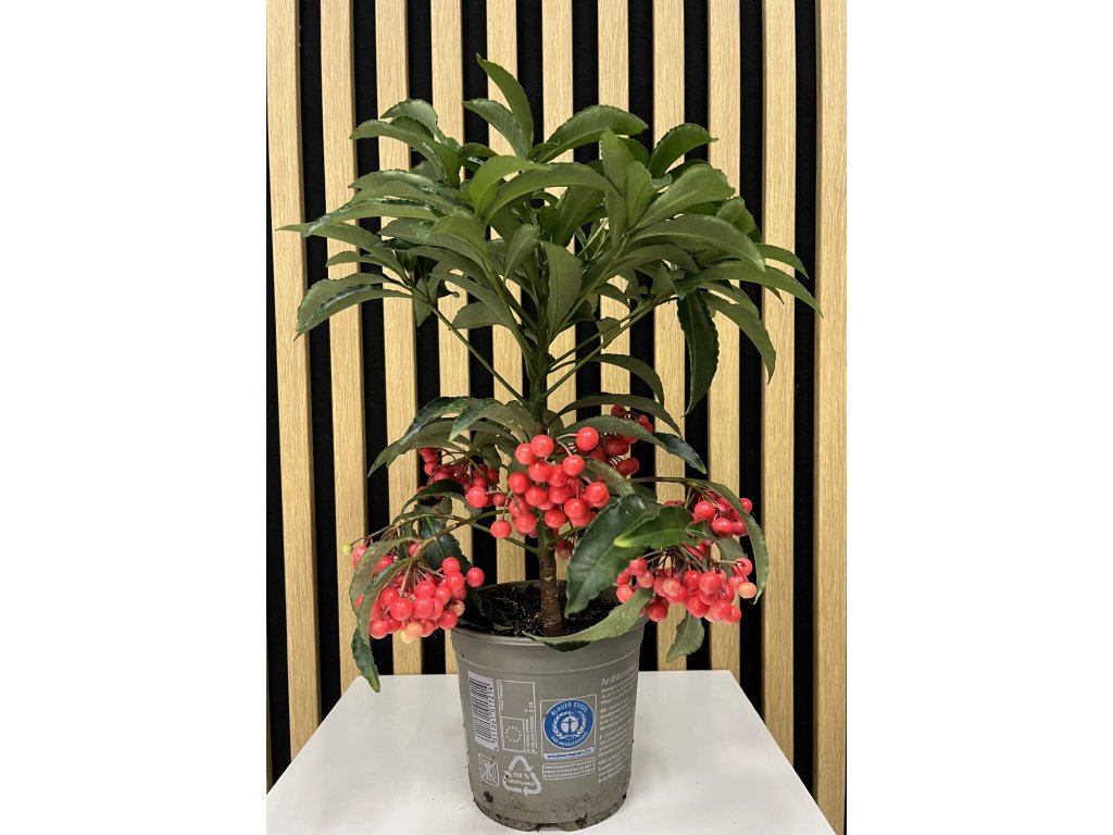 Ardisia (Ardisia crenata) je atraktivní pokojová rostlina, která okamžitě upoutá pozornost svými sytě zelenými, lesklými listy a nápadnými červenými bobulemi. Tyto dekorativní plody přetrvávají na rostlině i několik měsíců a dodávají jí luxusní, slavnostní vzhled – ideální zejména v zimním období. Ardisia je oblíbenou volbou pro milovníky netradičních pokojovek, které dokážou ozdobit interiér po celý rok.