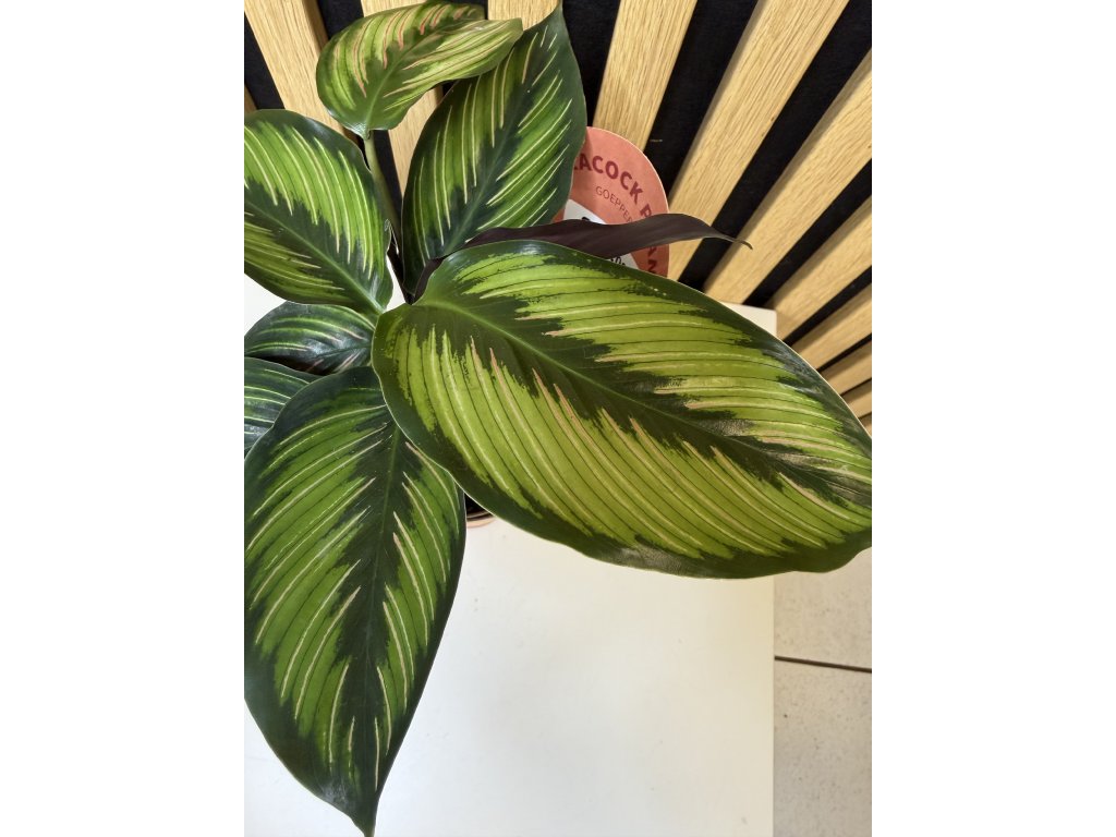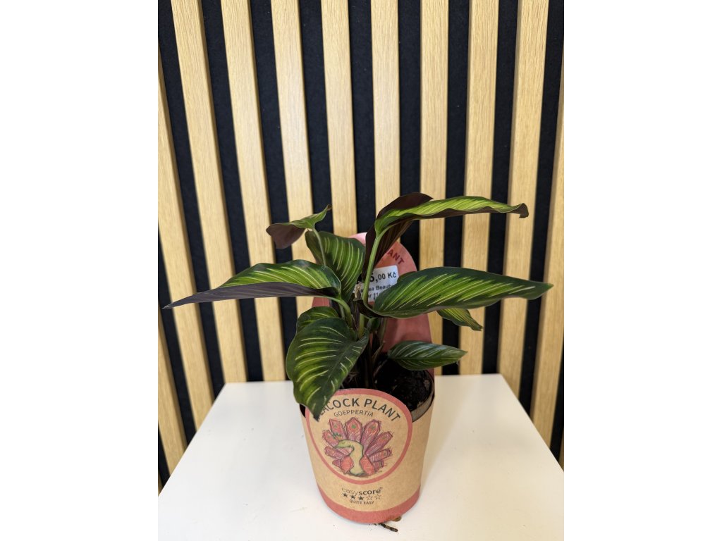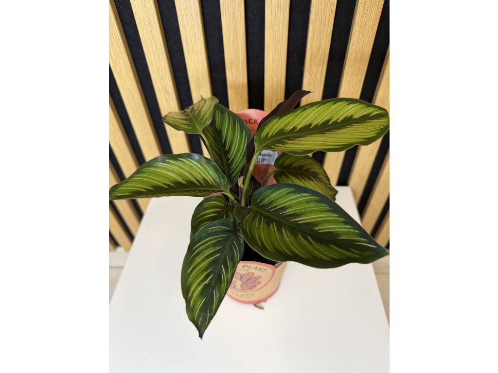 Calathea Beauty Star patří mezi nejpůvabnější zástupce rodu Calathea. Okouzlí dlouhými, úzkými listy s jemným pruhováním v odstínech světle zelené, tmavě zelené a krémové. Spodní strana listů má typický lehce fialový nádech, díky kterému rostlina působí luxusně a exoticky. Večer své listy částečně sklápí a ráno je znovu rozevírá – doslova živá dekorace interiéru.