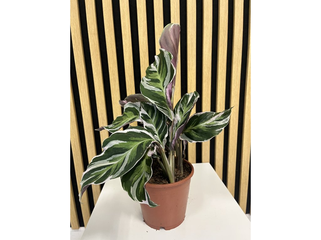 Calathea Fusion je výjimečná pokojová rostlina, která okouzlí svým neobyčejným vzhledem. Její velké, oválné listy zdobí nádherná kombinace zelených, bílých a někdy i jemně růžových tónů, které vytvářejí originální mramorovaný vzor. Každý list je jedinečný, díky čemuž působí rostlina jako živé umělecké dílo.