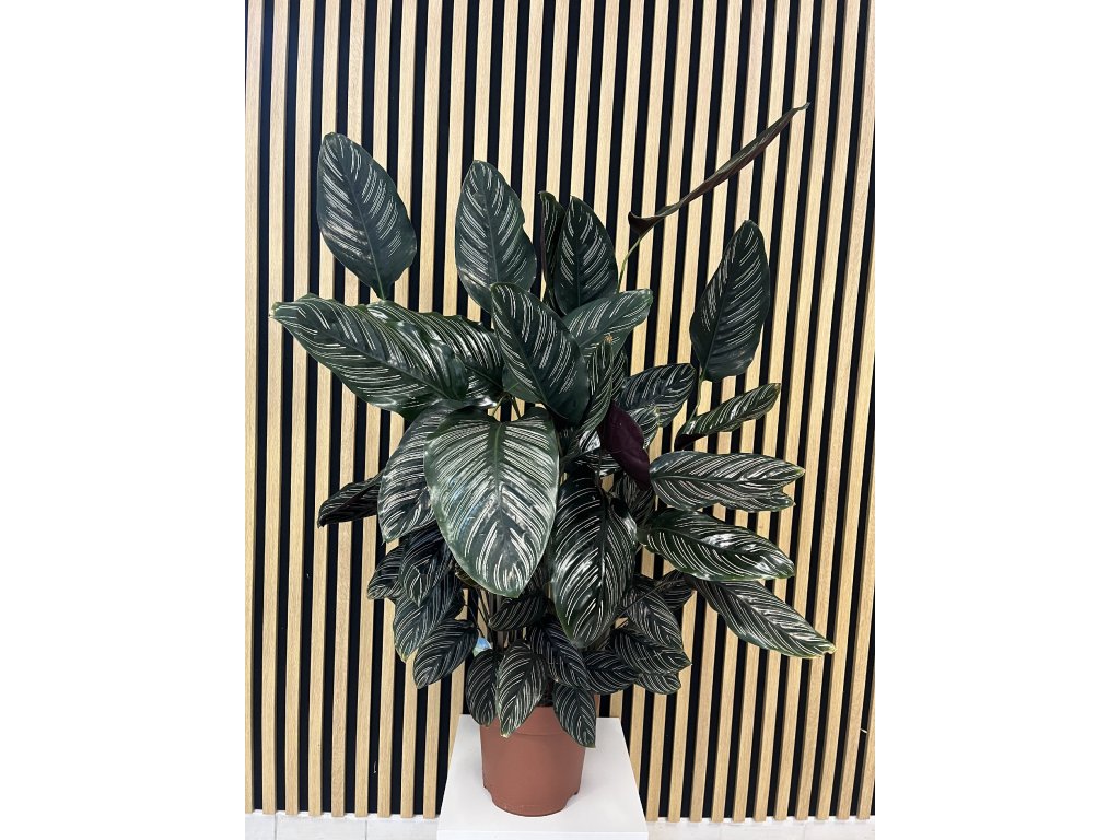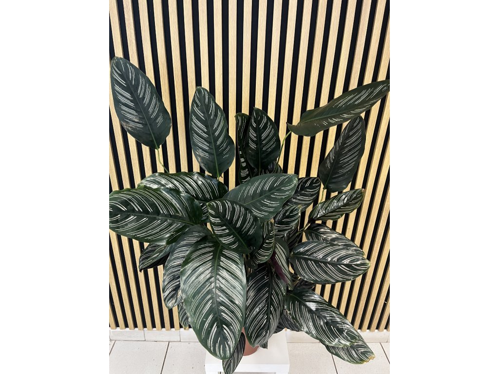 Calathea sanderiana je luxusní pokojová rostlina pocházející z tropických pralesů Jižní Ameriky. Její velké, oválné listy mají temně zelený podklad, na kterém se nádherně vyjímají jemné růžové až krémově bílé pruhy. Spodní strana listů je zbarvena do sytě vínově fialového odstínu, což rostlině dodává atraktivní kontrast a exotický půvab. Díky svému výraznému vzhledu se stane nepřehlédnutelnou dominantou každého interiéru.