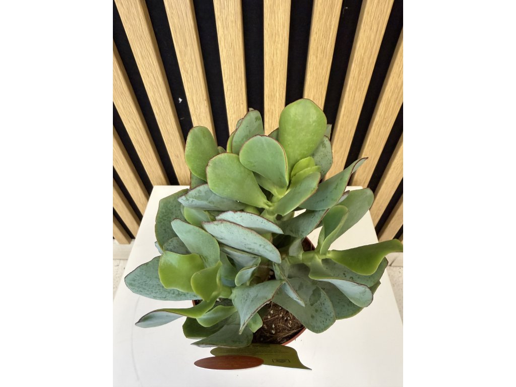 Crassula arborescens je impozantní sukulentní rostlina pocházející z Jižní Afriky, která zaujme svými velkými, kulatými až oválnými listy v jemném stříbřitě zeleném odstínu. Listy jsou silné, masité a často lemované tenkým červeným okrajem, který se zvýrazňuje při dostatku světla. Díky tomuto zbarvení působí rostlina velmi elegantně a luxusně.