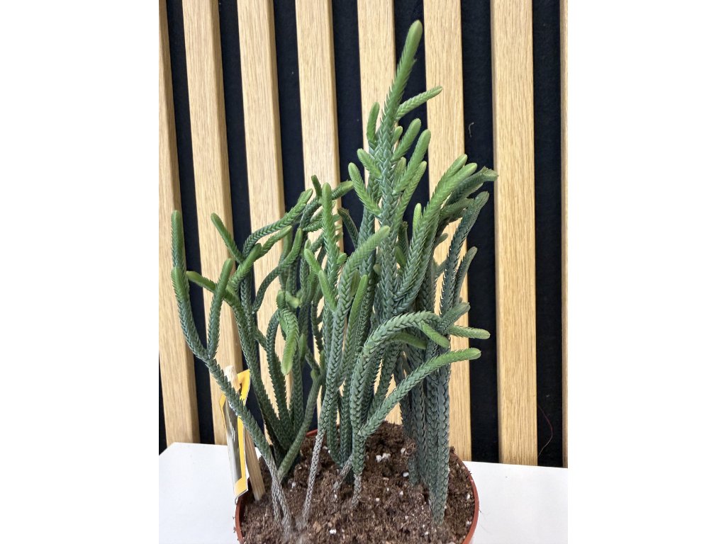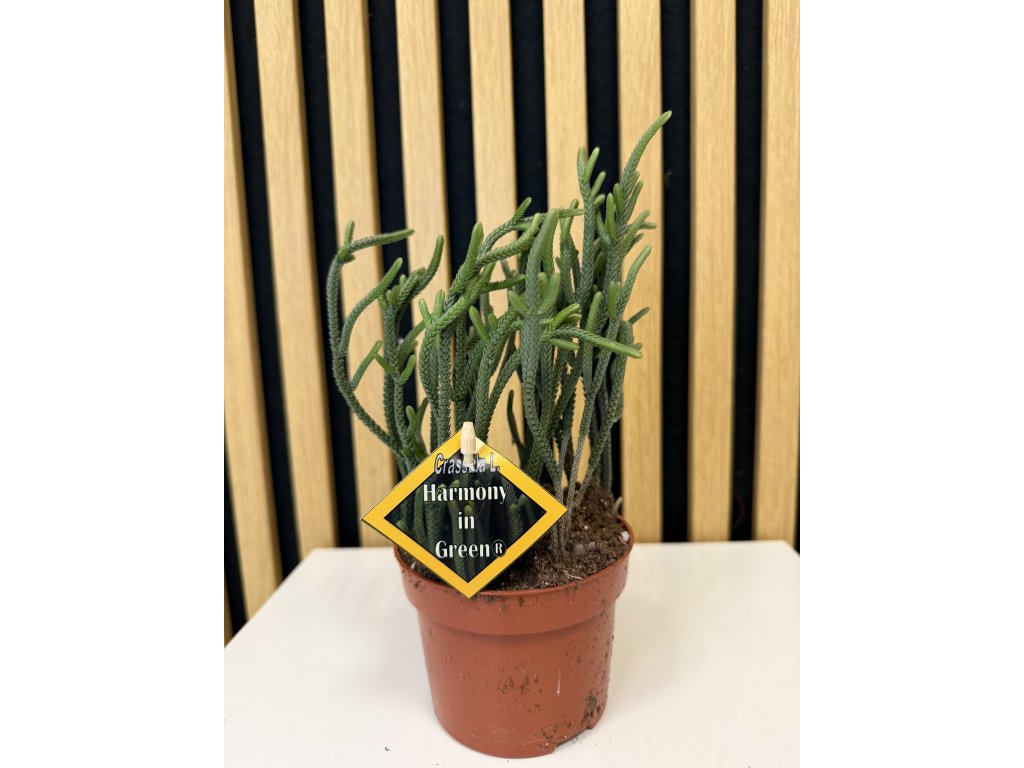 Crassula ‘Harmony Green’ je elegantní a velmi dekorativní sukulent, který zaujme svým dokonale uspořádaným růstem a svěží zelenou barvou listů. Masité, hladké listy jsou naskládány v přesných protilehlých párech a vytvářejí geometricky působící strukturu připomínající živou sochu. Díky této pravidelnosti působí rostlina harmonicky a klidně, což se odráží i v jejím názvu.
