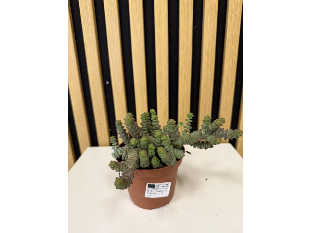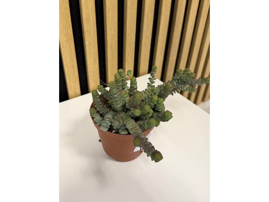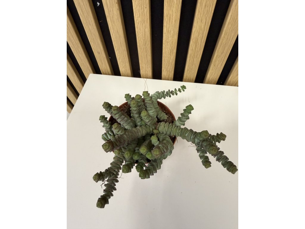 Crassula Hottentot je atraktivní a netradiční druh tlustice, který okamžitě zaujme svým vzhledem. Její masité, drobné a kulaté lístky připomínají korálky navlečené na provázku a tvoří husté, převislé výhony. Díky tomu je ideální do závěsných květináčů nebo na vyvýšené police, odkud může elegantně splývat dolů. Sytě zelené listy s lehkým červeným nádechem na slunci dodávají rostlině živý a dekorativní vzhled.