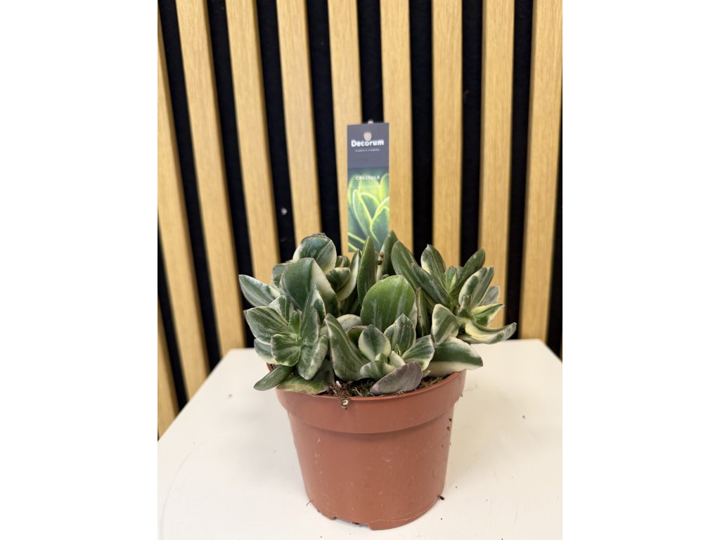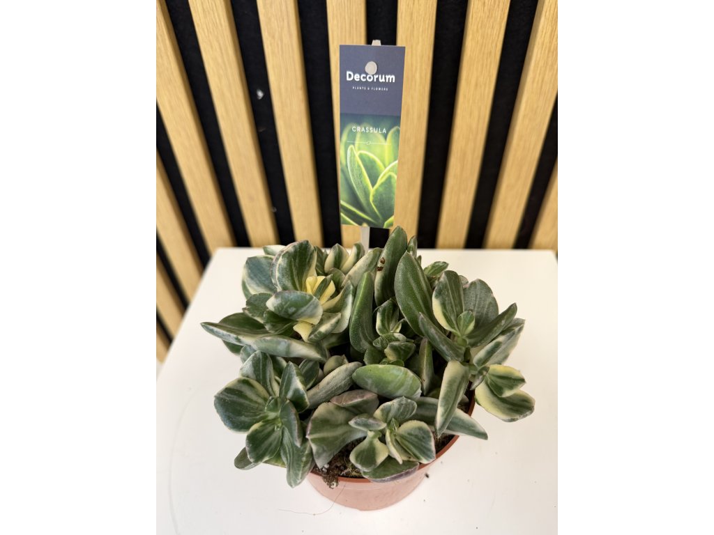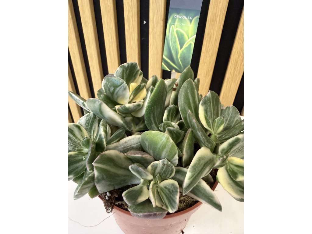 Crassula ovata ‘Variegata’ je velmi oblíbený sukulent s dekorativními, masitými listy zdobenými jemnou panašovanou kresbou. Listy mají sytě zelený střed doplněný krémově bílými až nažloutlými okraji, které se při dostatku světla mohou zbarvovat do jemných růžových tónů. Díky této barevné kombinaci působí rostlina svěže, elegantně a výrazně zároveň.