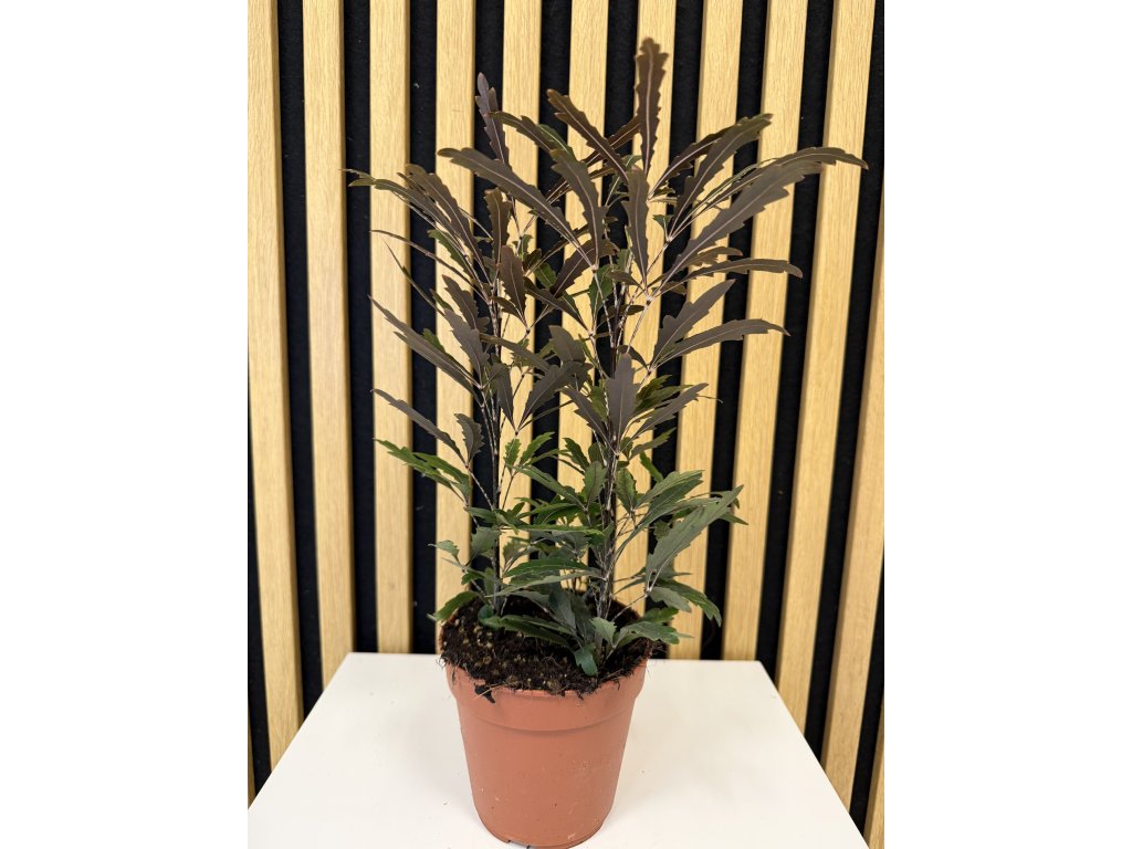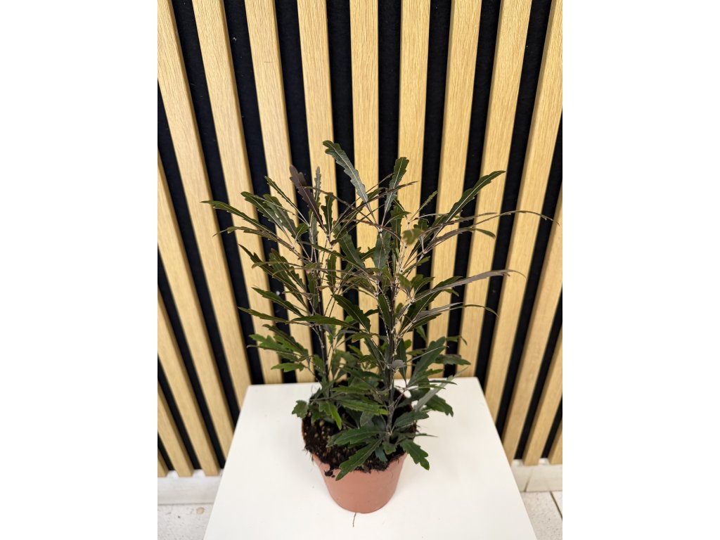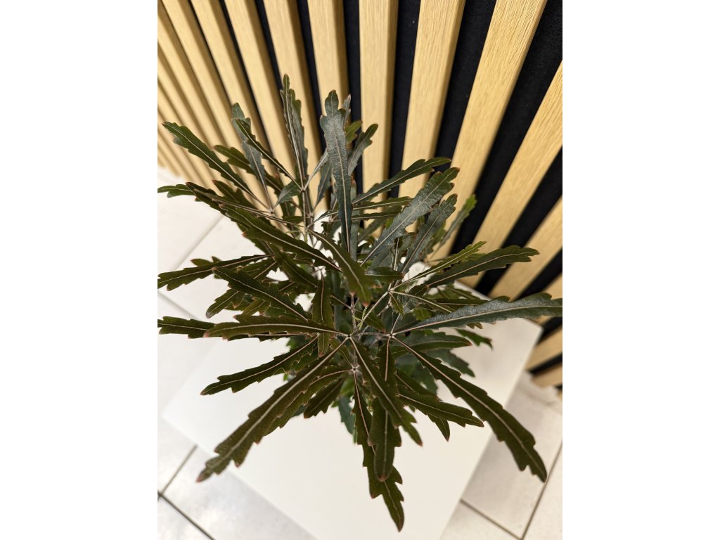Dizygotheca (Schefflera elegantissima) je elegantní a výrazná pokojová rostlina, která zaujme svým štíhlým růstem a jemně exotickým vzhledem. Její typickým znakem jsou úzké, dlouhé, hluboce vykrajované listy tmavě zelené až téměř černozelené barvy, které působí velmi dekorativně a moderně. Díky svému vzdušnému tvaru se skvěle hodí do minimalistických i luxusních interiérů.