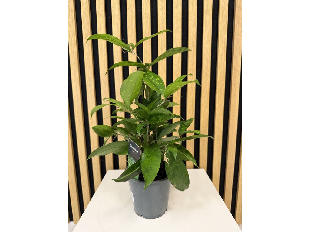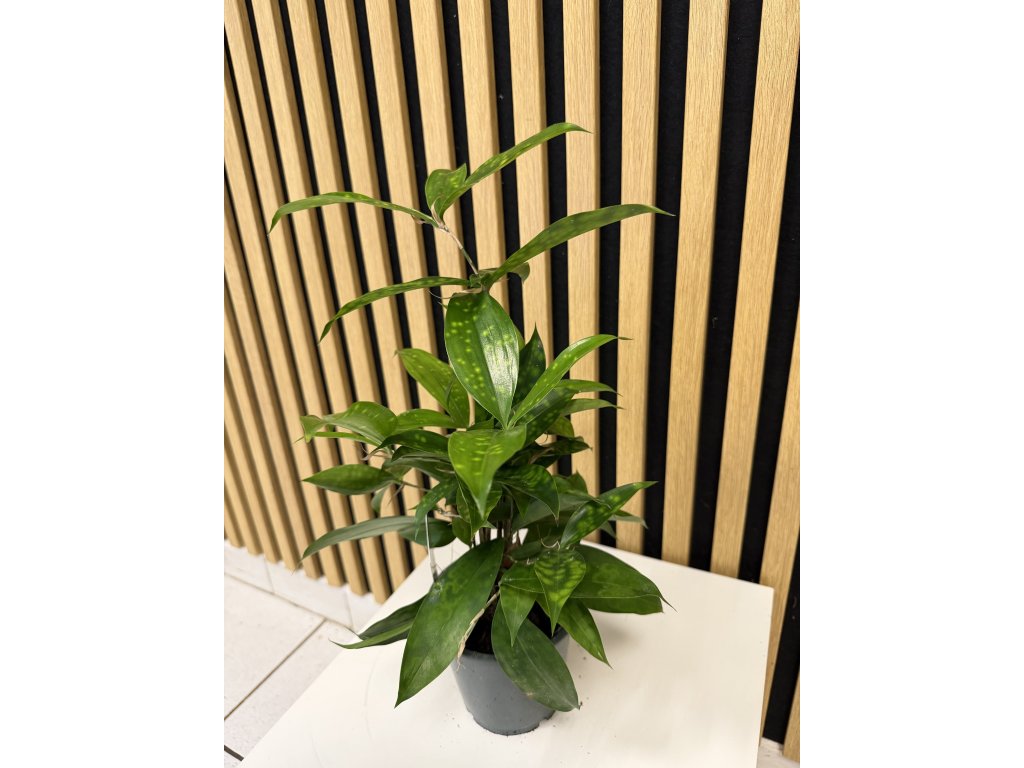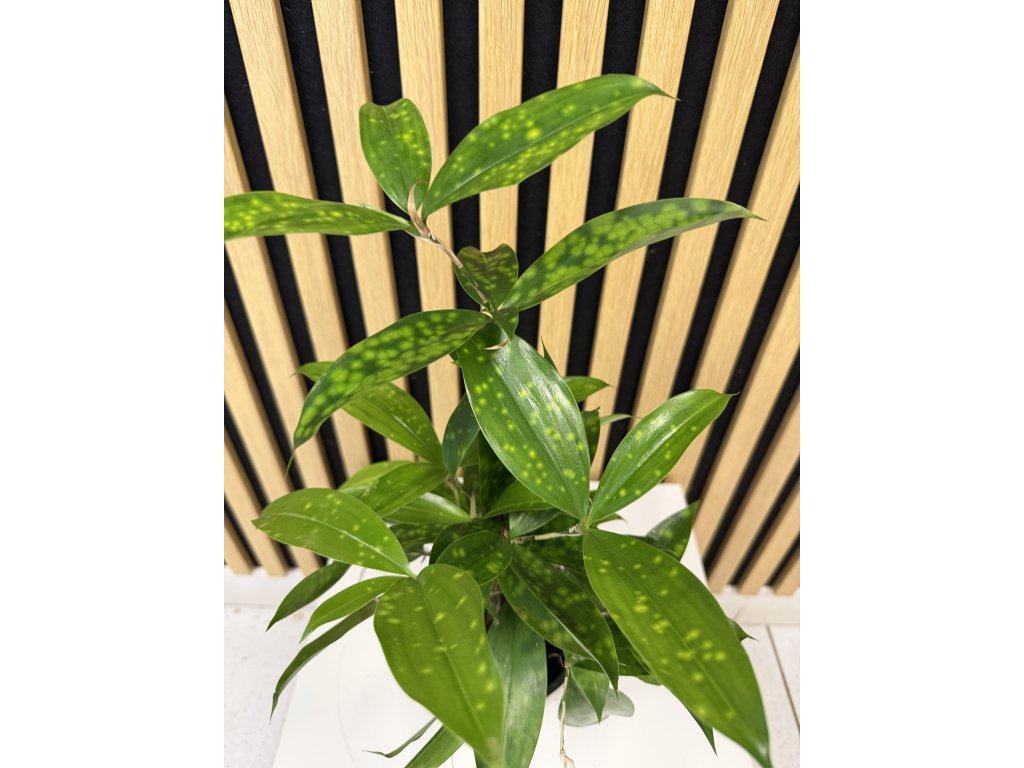 Dracaena surculosa, známá také pod názvem Dracena zlatoplodá, je výjimečná pokojová rostlina ceněná pro své tmavě zelené listy poseté drobnými krémovými až žlutými skvrnami. Na rozdíl od klasických dracén má keříčkovitý růst a jemnější, svěží vzhled, který působí velmi dekorativně v moderních i klasických interiérech.