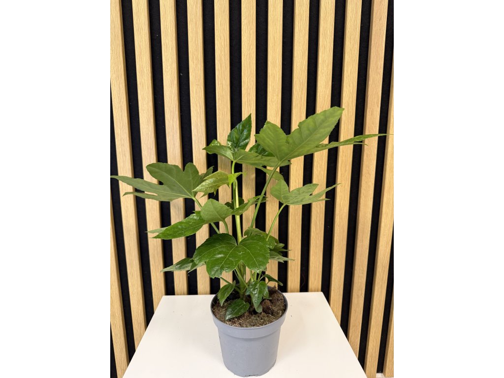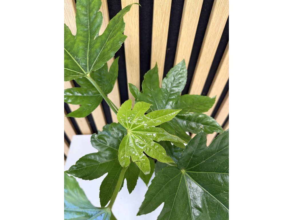 Fatsia japonica je výrazná okrasná rostlina s exotickým vzhledem, která se vyznačuje velkými, lesklými, dlanitě členěnými listy sytě zelené barvy. Díky svému robustnímu růstu a elegantnímu tvaru působí jako dominantní solitér a okamžitě dodá interiéru tropický nádech. Je oblíbená nejen jako pokojová rostlina, ale také jako přenosná rostlina na terasy, balkony či do zimních zahrad.