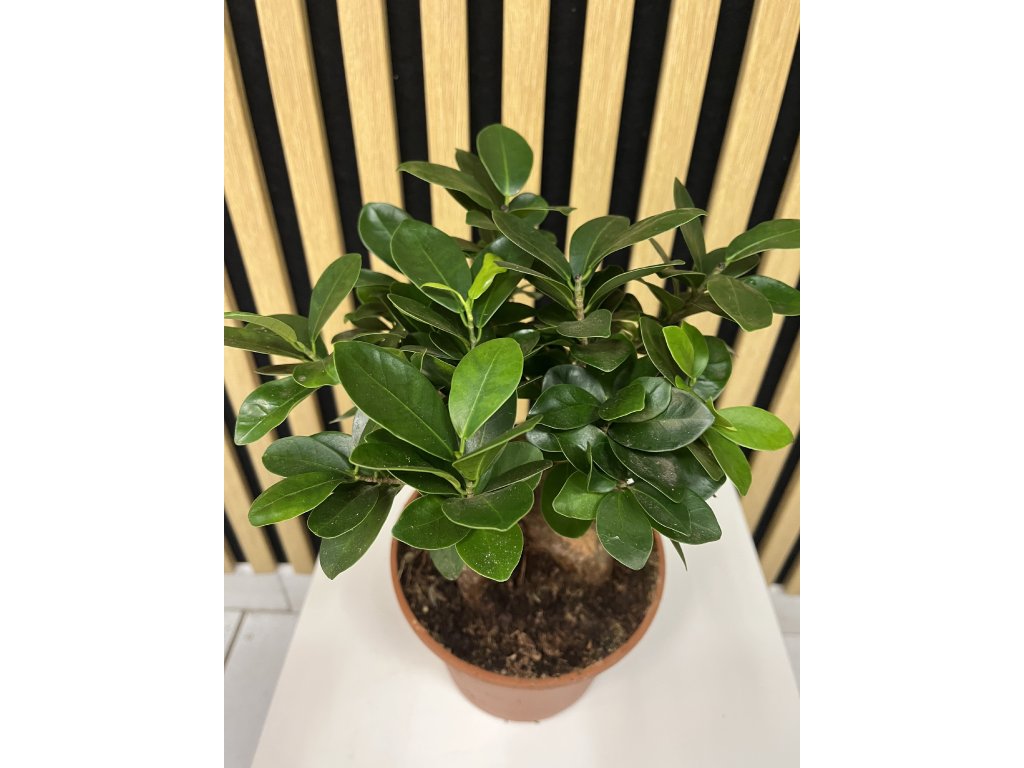 Ficus microcarpa ‘Ginseng’ je atraktivní pokojová rostlina, která svým vzhledem připomíná bonsaj. Charakteristickým znakem jsou její silné, zakřivené kořeny nad povrchem substrátu a hustá koruna drobných, lesklých, sytě zelených lístků. Díky tomuto kontrastu působí rostlina jako přírodní socha a v interiéru okamžitě přitáhne pozornost.