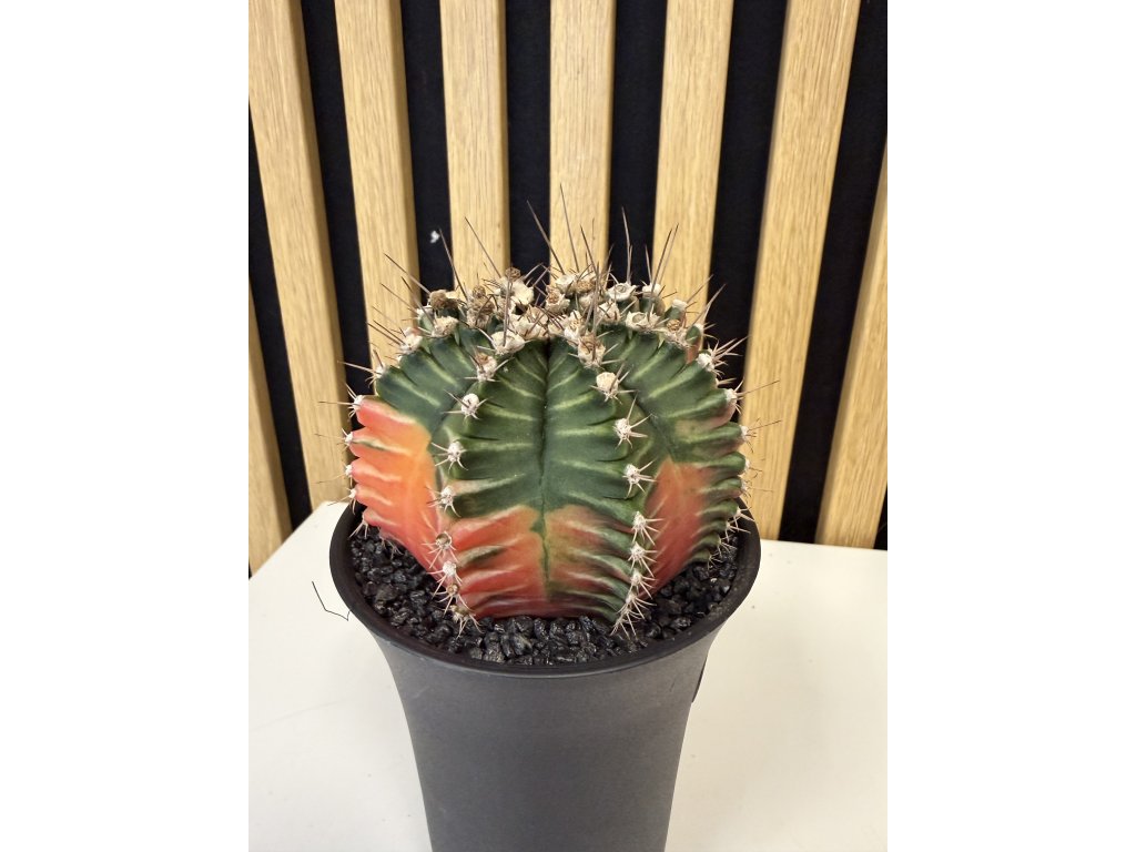 Gymnocalycium mihanovichii variegata je výjimečný a velmi atraktivní kaktus, který si získá pozornost svou nepravidelnou panašovanou kresbou. Kulovité až mírně zploštělé tělo má základní zelenou barvu doplněnou o výrazné žluté, krémové, oranžové či načervenalé skvrny. Každá rostlina je naprostý originál – rozložení barev je u každého kusu jiné.