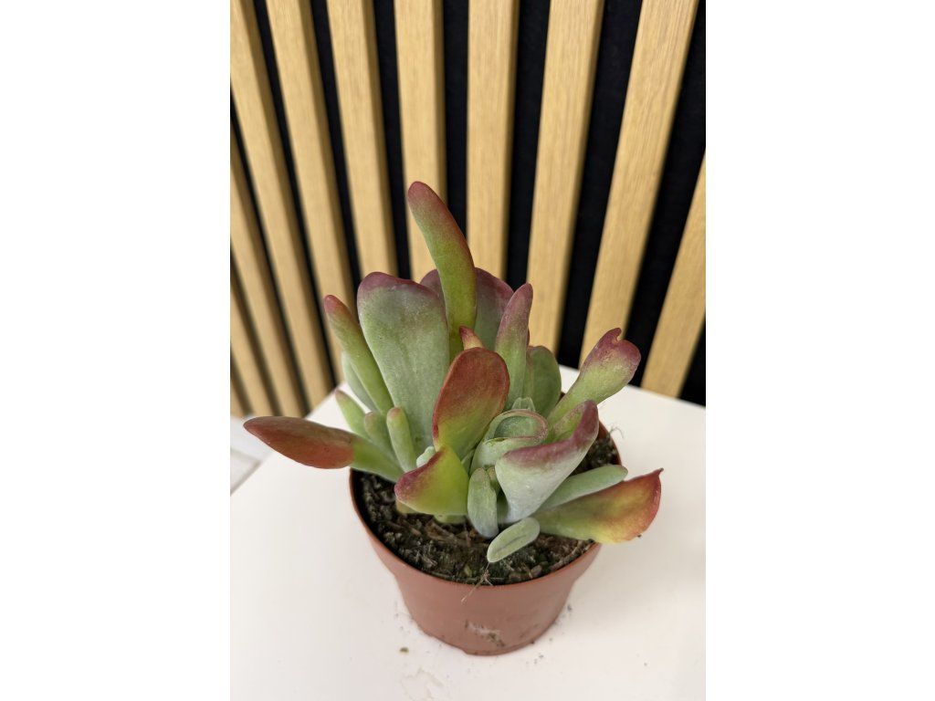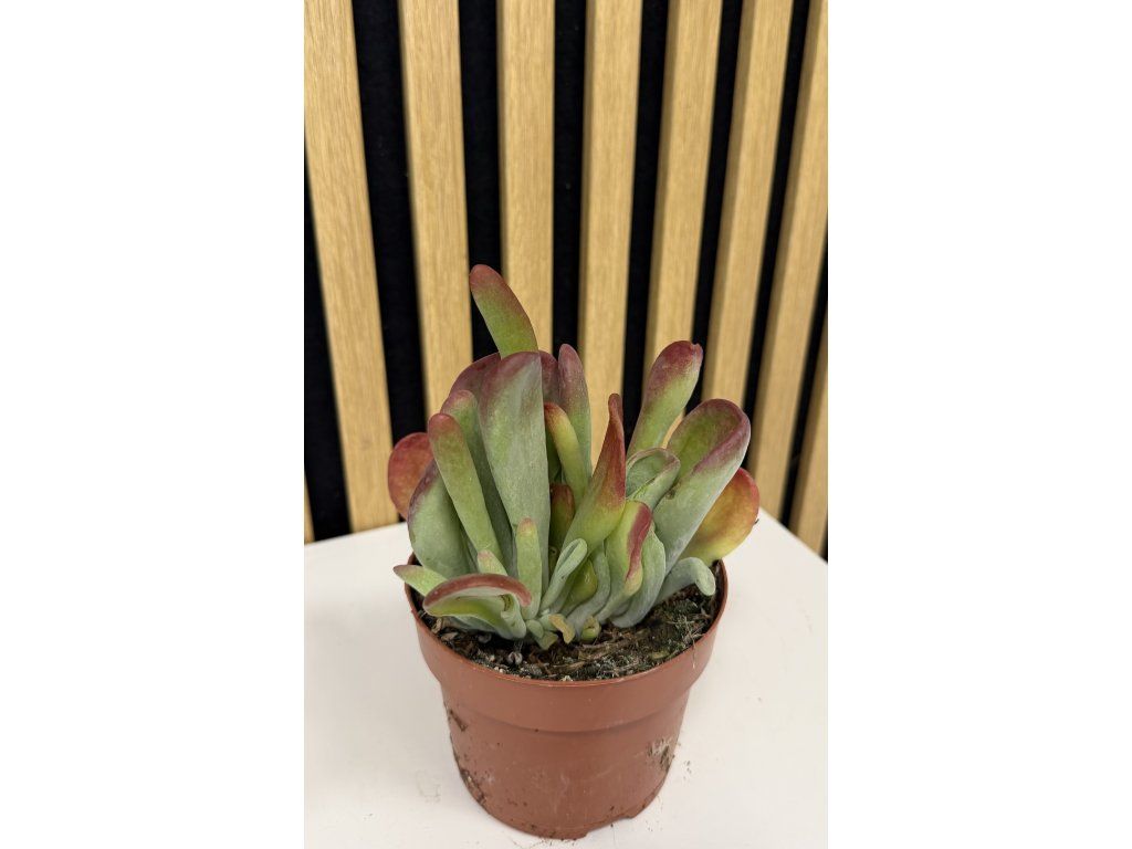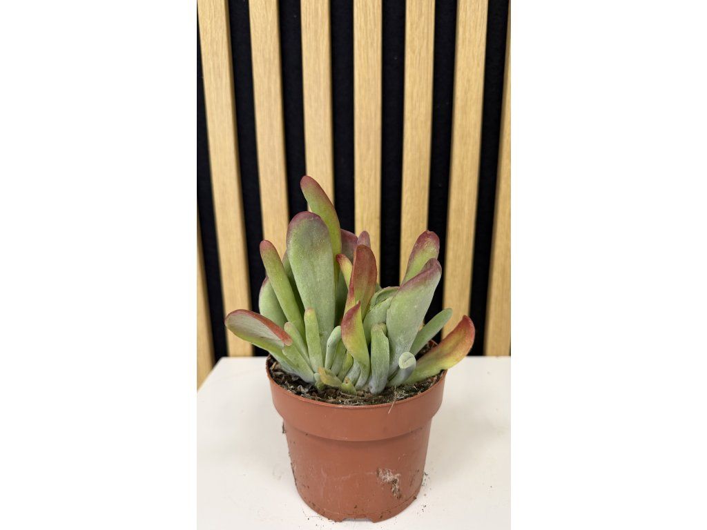 Kalanchoe Oricula je atraktivní sukulentní rostlina, která zaujme svými masitými, jemně plstnatými listy v šedozelených až stříbřitých tónech. Okraje listů mohou mít lehce narůžovělý až načervenalý nádech, zejména při dostatku světla. Díky svému kompaktnímu růstu a dekorativnímu vzhledu působí velmi moderně a stává se nepřehlédnutelným doplňkem každého interiéru.