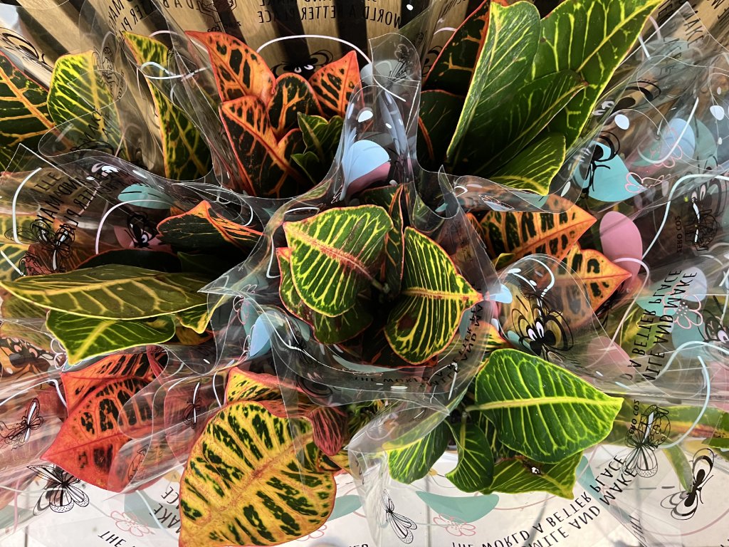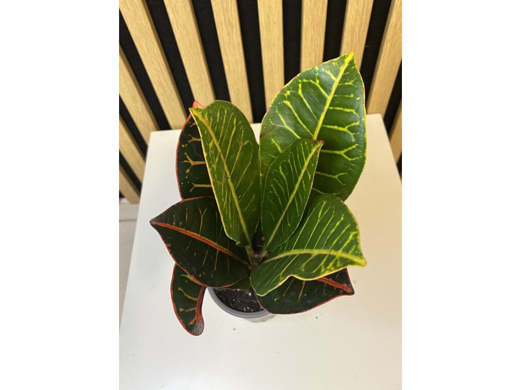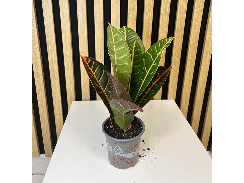 Codiaeum variegatum ‘Petra’, známý také jako Kroton Petra, je výrazná pokojová rostlina, která si získá pozornost svými lesklými, sytě zbarvenými listy. Kombinuje tóny zelené, žluté, oranžové a červené – díky tomu působí velmi dekorativně a přináší do prostoru živou energii a exotický nádech.