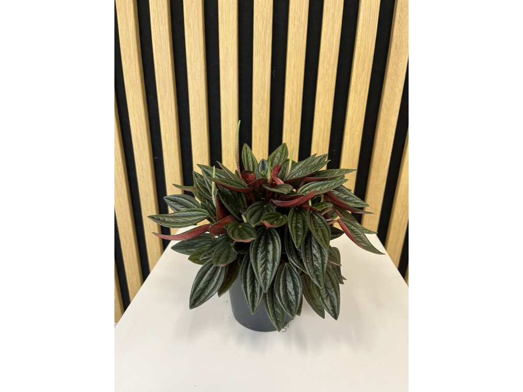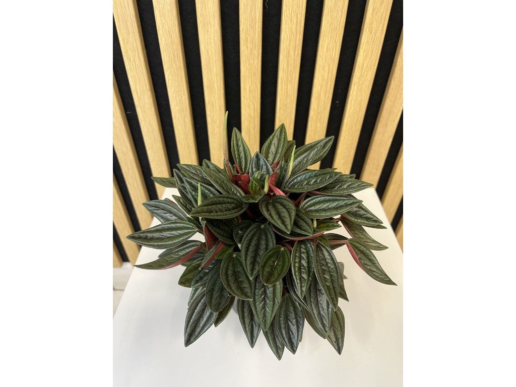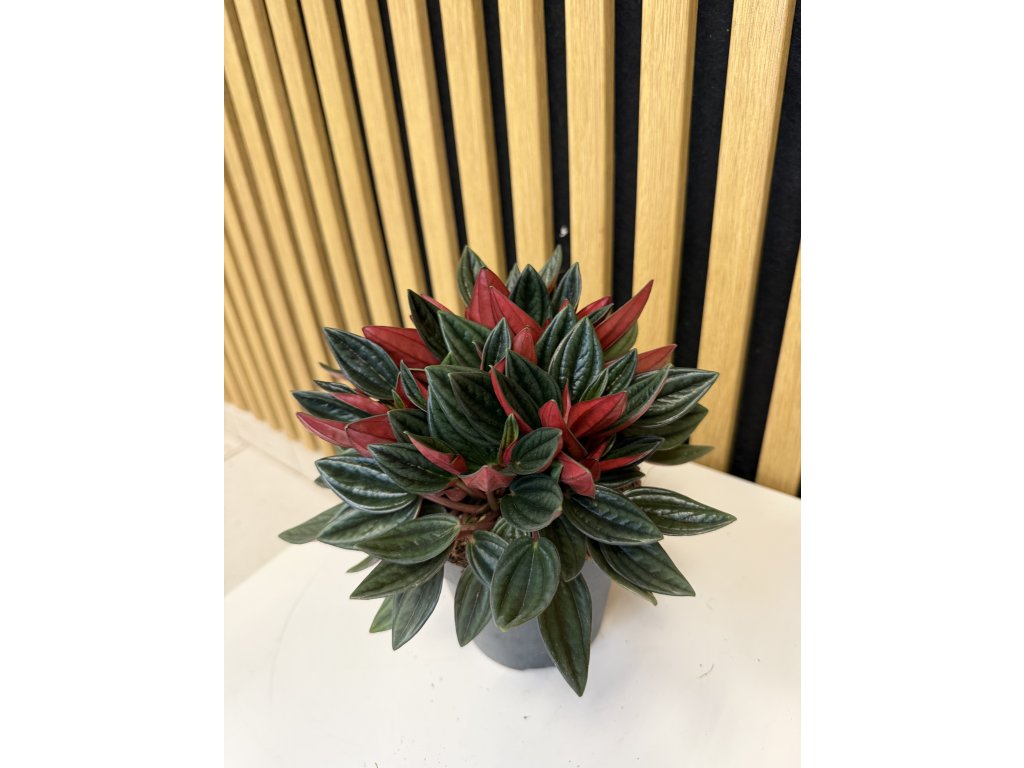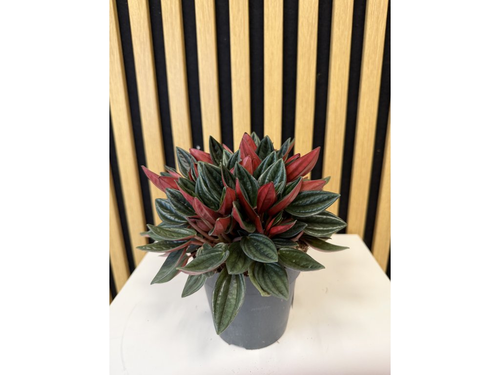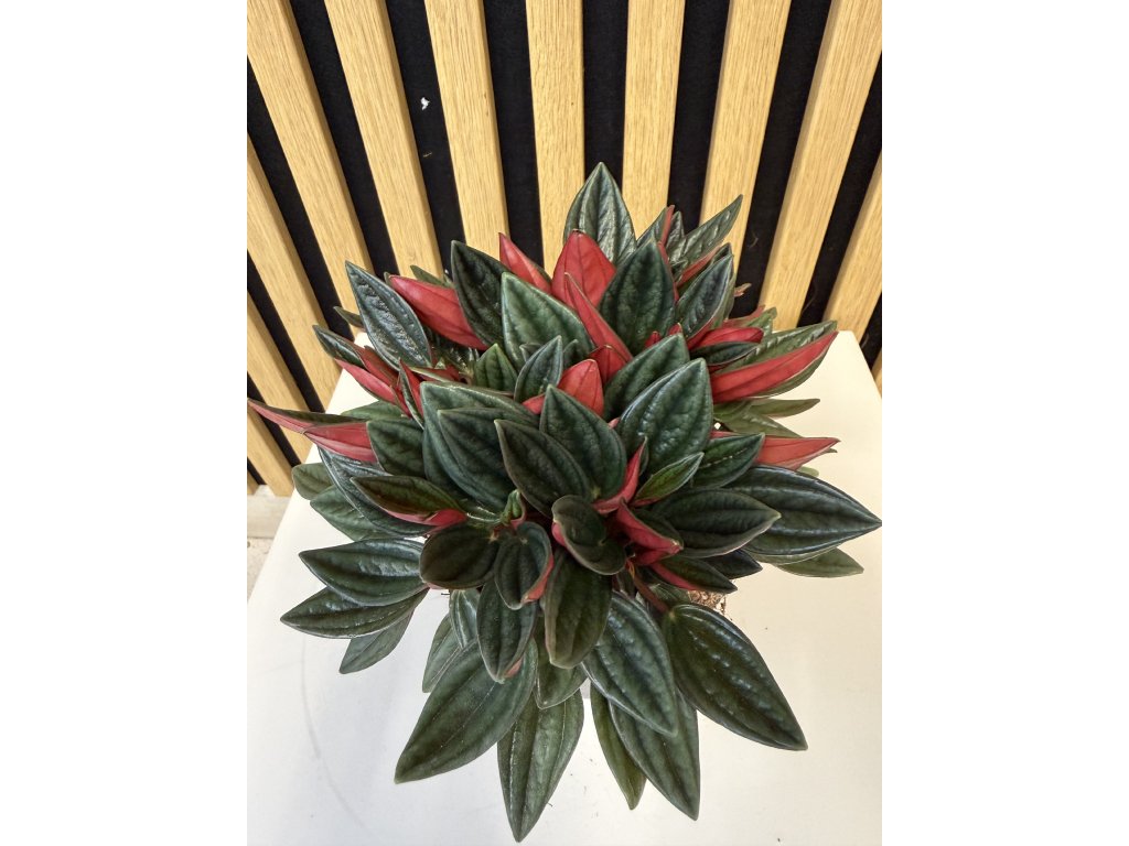 Peperomia caperata Rosso je nádherná a nenáročná pokojová rostlina pocházející z tropických oblastí Brazílie. Je ceněná pro svůj originální vzhled – její úzké, protáhlé listy mají sytě zelenou svrchní stranu, zatímco spodní strana překvapí intenzivně vínově červeným odstínem. V kombinaci s kompaktním růstem tvoří rostlina elegantní dekoraci, která skvěle zapadne do moderních interiérů i menších prostor.