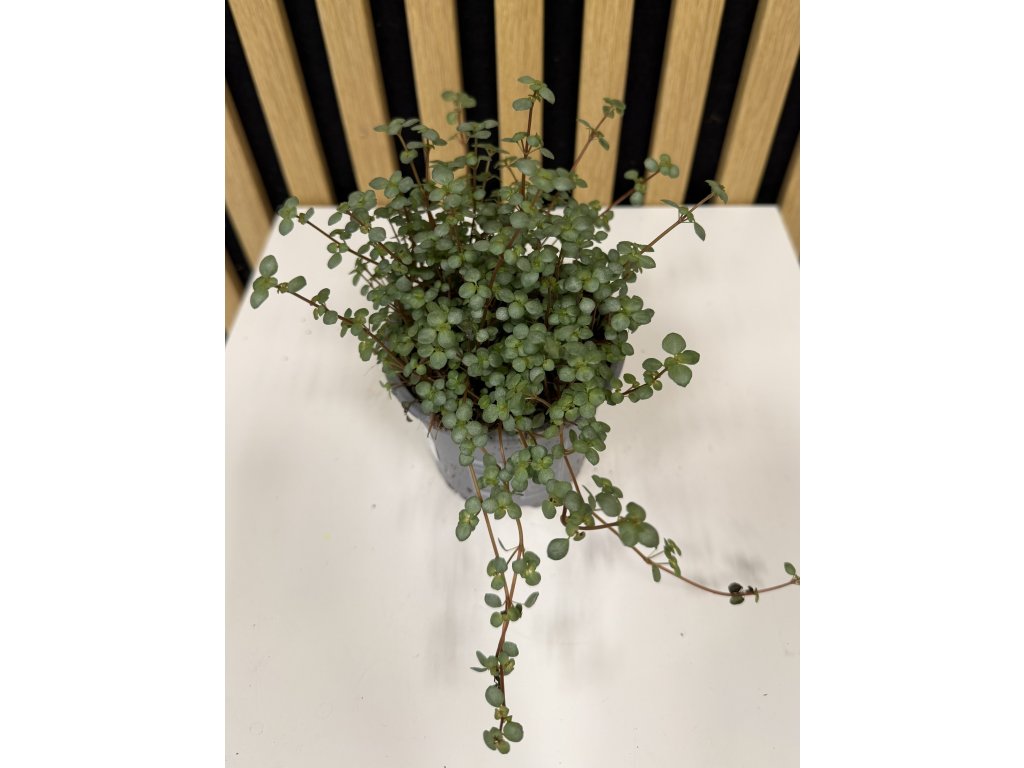 Pilea Greyzy vytváří husté převisy tenkých stonků pokrytých drobnými, kulatými listy s jemným šedozeleným nádechem. Listy mají lehce matný až stříbřitý efekt, který dodává rostlině unikátní vzhled.