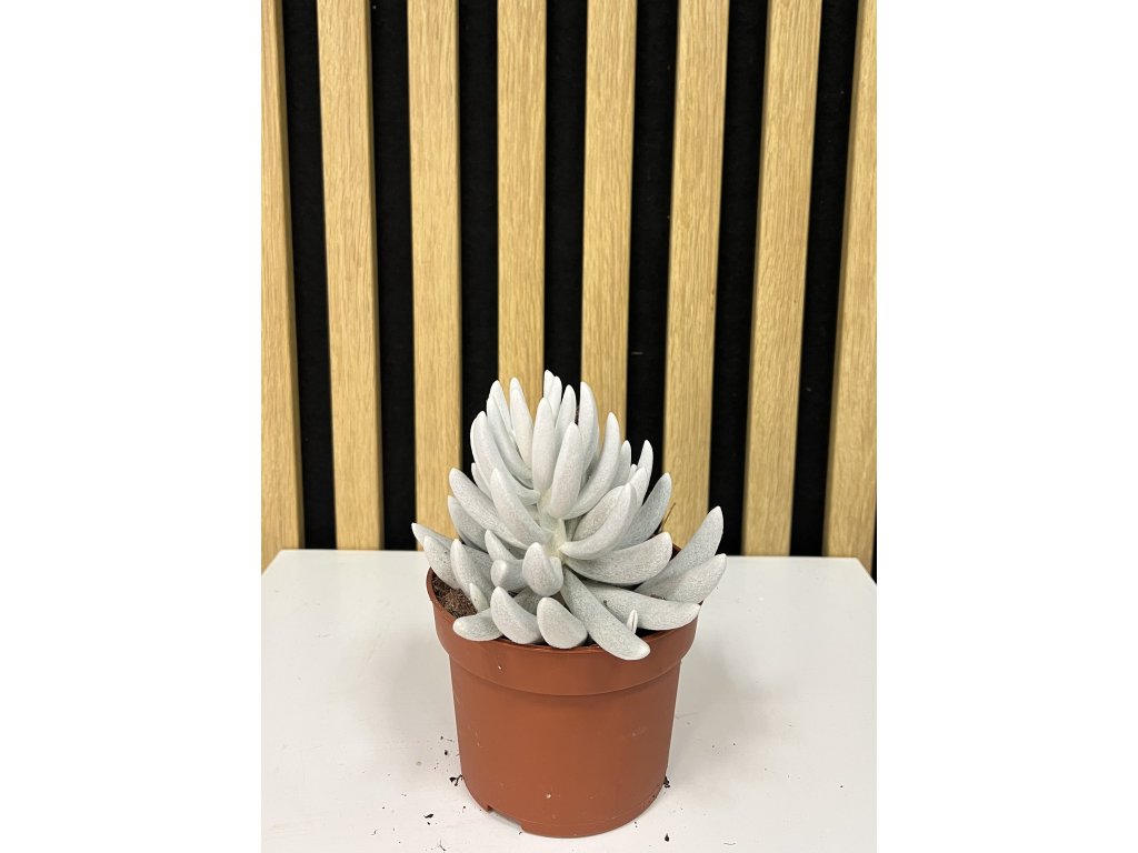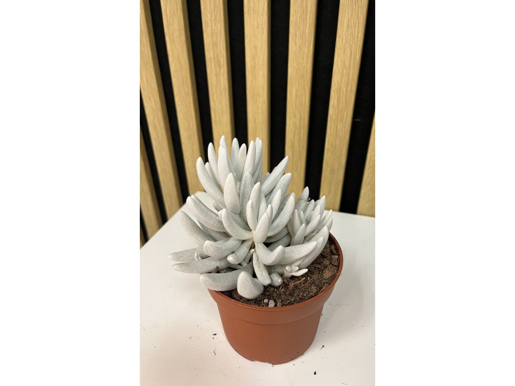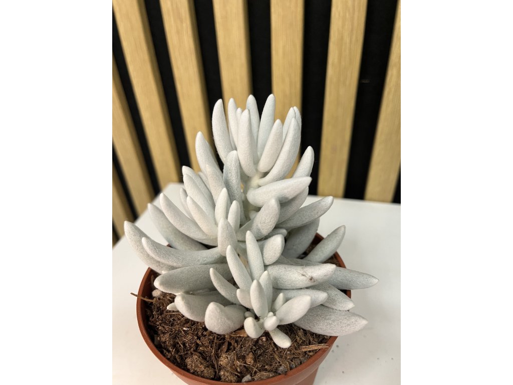Senecio Mont Blanc je výjimečná a dekorativní sukulentní rostlina, která zaujme svým unikátním zbarvením. Její masité, protáhlé listy mají světle zelený až bělavý tón s jemným ojíněním, které připomíná zasněžené hřebeny hor – odtud název Mont Blanc. Rostlina působí velmi čistě, moderně a skvěle zapadá do minimalistických i přírodních interiérů.