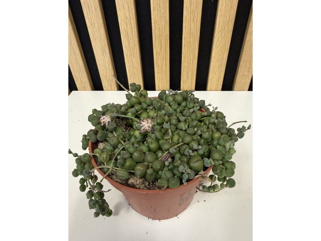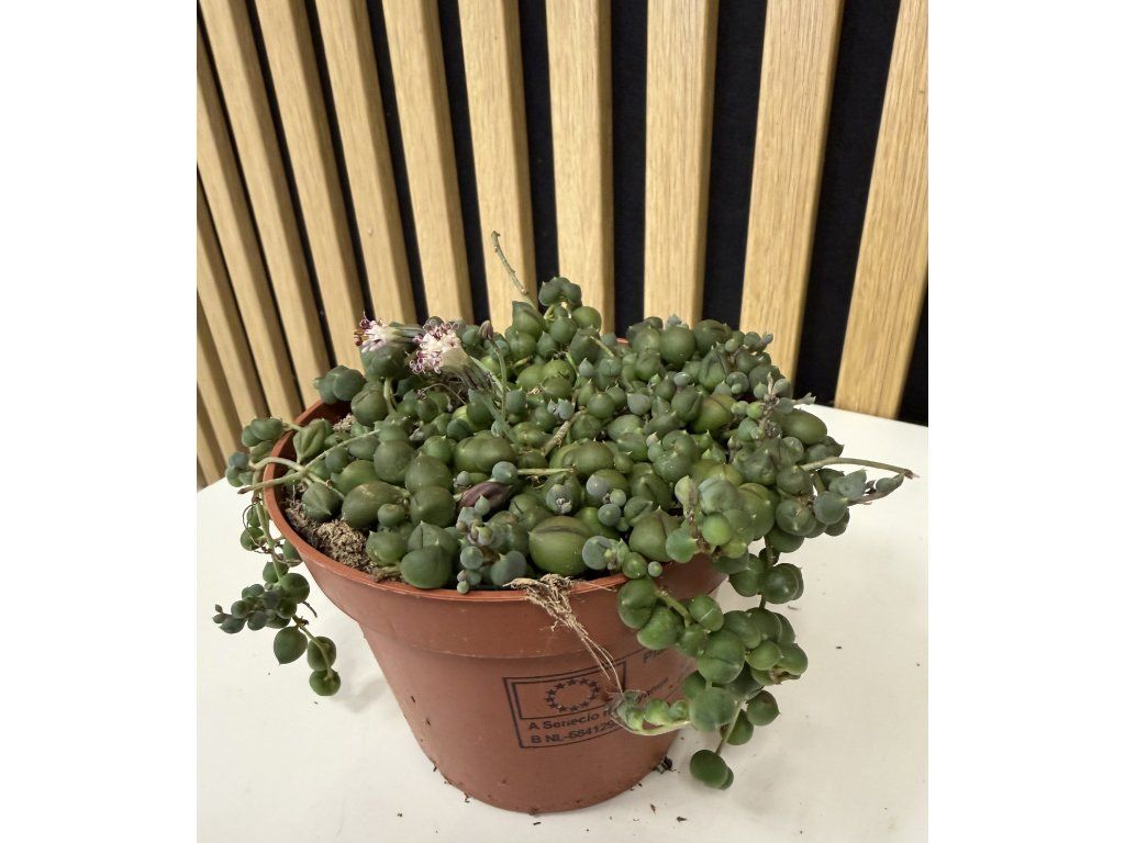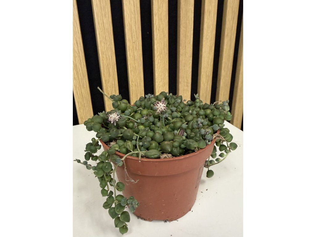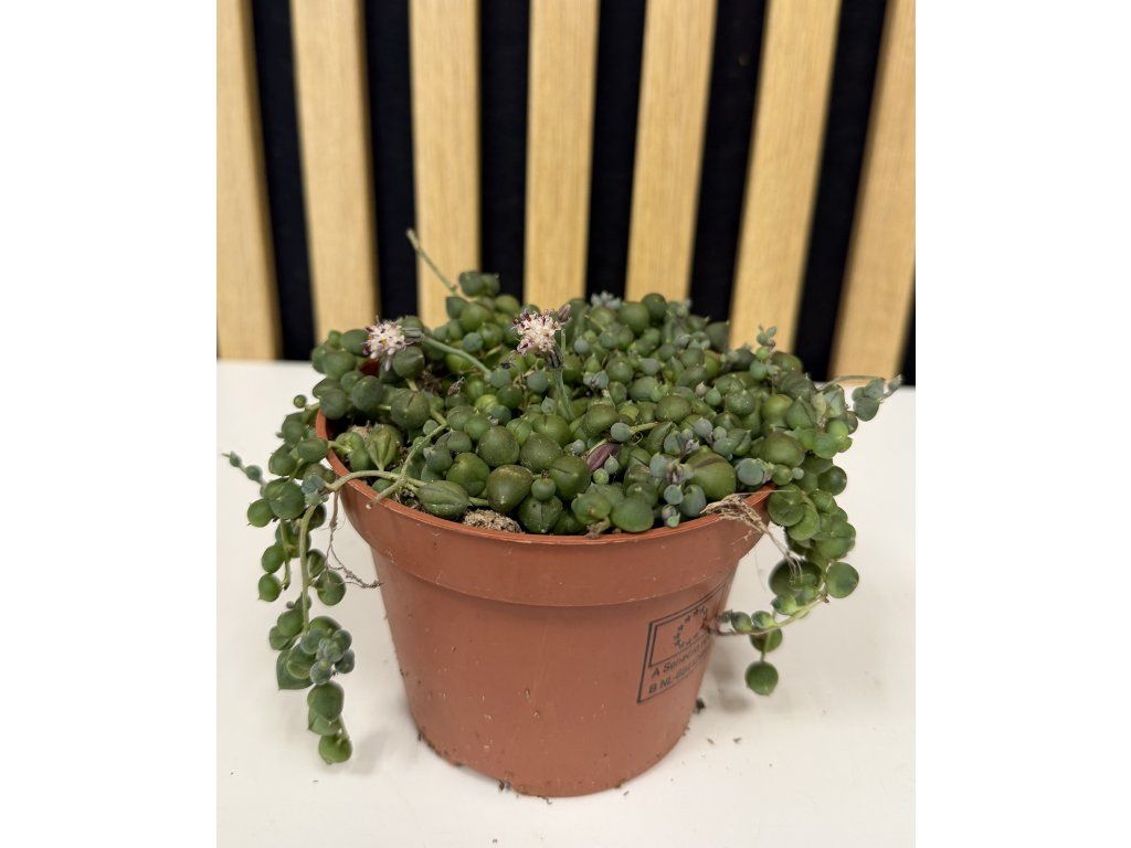 Senecio rowleyanus je ikonická převislá sukulentní rostlina, která zaujme na první pohled svými kulatými lístky připomínajícími zelené korálky navlečené na jemných stoncích. Díky svému netradičnímu vzhledu patří mezi nejoblíbenější závěsné pokojové rostliny a je skutečným designovým doplňkem moderních interiérů.
